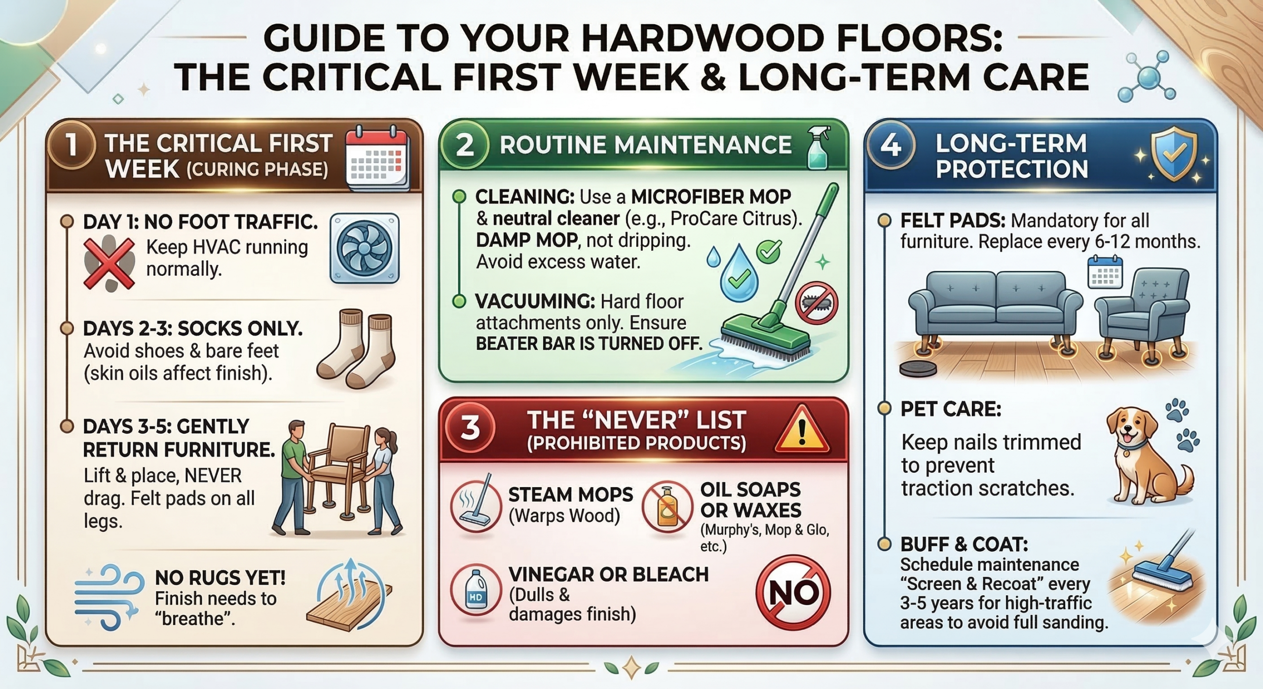 Congratulations on your restored hardwood floors! With the right care and maintenance, your floors will stay beautiful for decades. Please follow the guidelines below to ensure the finish cures properly and the wood remains protected.